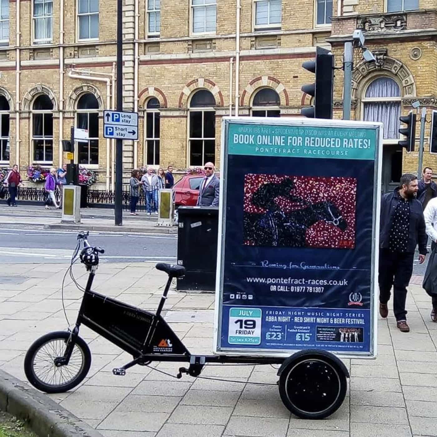 Each AdBike carry a surprisingly large integrated "AdPod"; this is big enough to host two sizeable 6-sheet posters (H1800mm x W1200mm) and is equipped with ample onboard storage allowing our savvy promotional riders to double-up as a built-in street team.